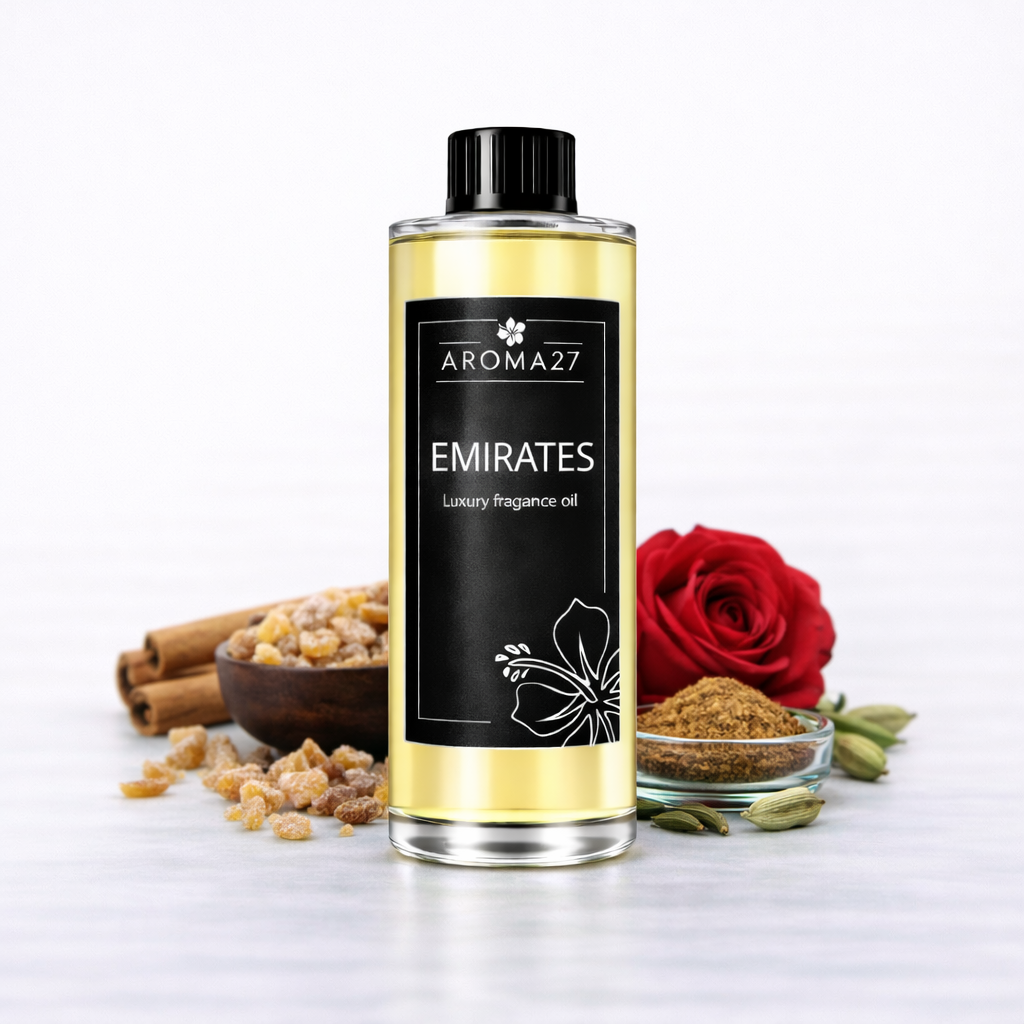 Explore the opulence and mystery of the Emirates with our exclusive fragrance. Emirates Fragrance Oil by Aroma27 combines citrus and spicy notes with a floral and woody touch, creating a sophisticated and enveloping aroma.